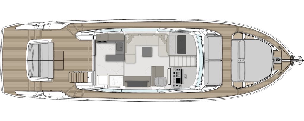 The hard top on the flybridge adds extra comfort by providing shade and protection, without compromising the elegance of the exterior profile. The flybridge is spacious and versatile, ideal for leisure, outdoor dining or simply relaxing at anchor.