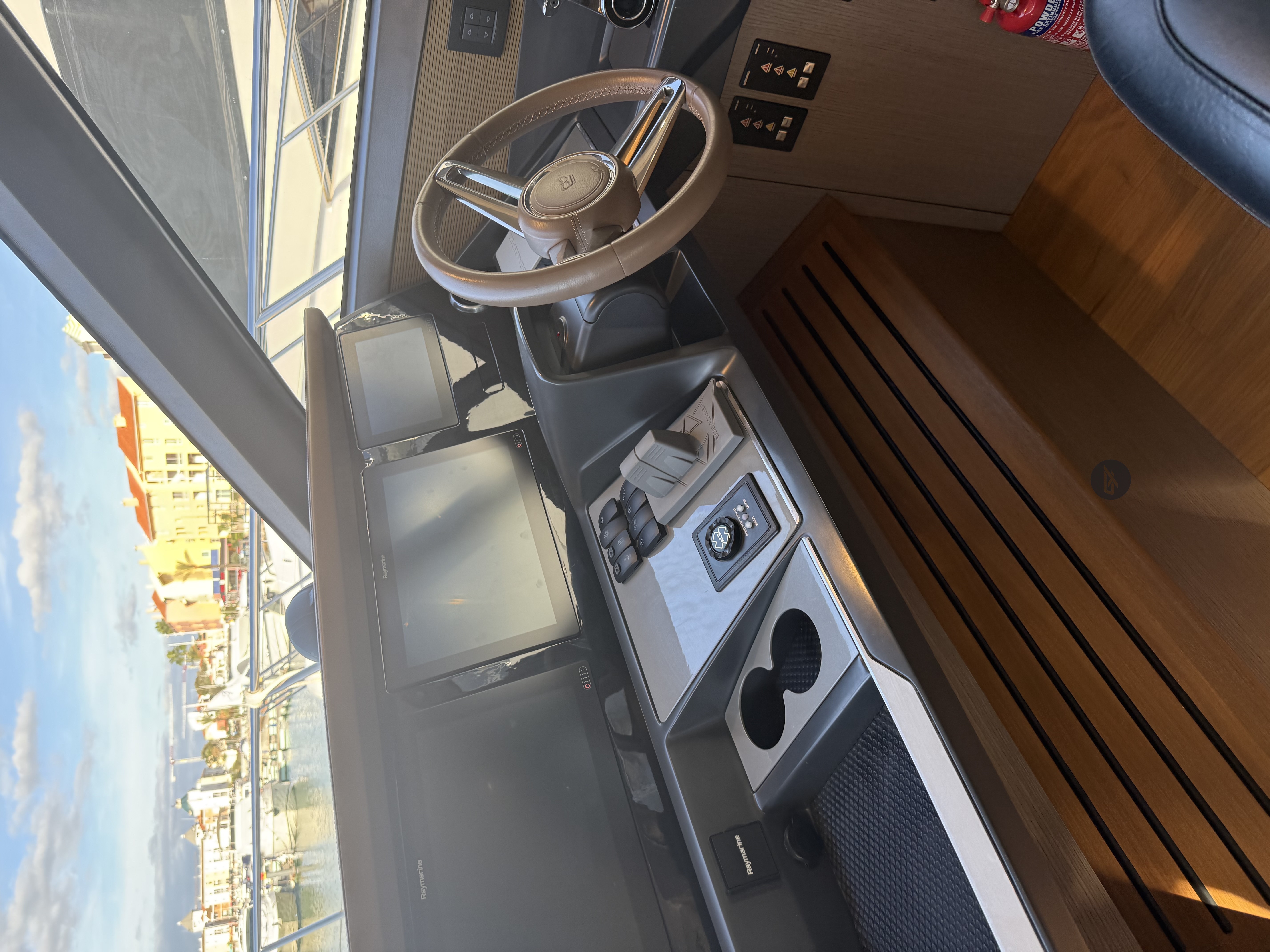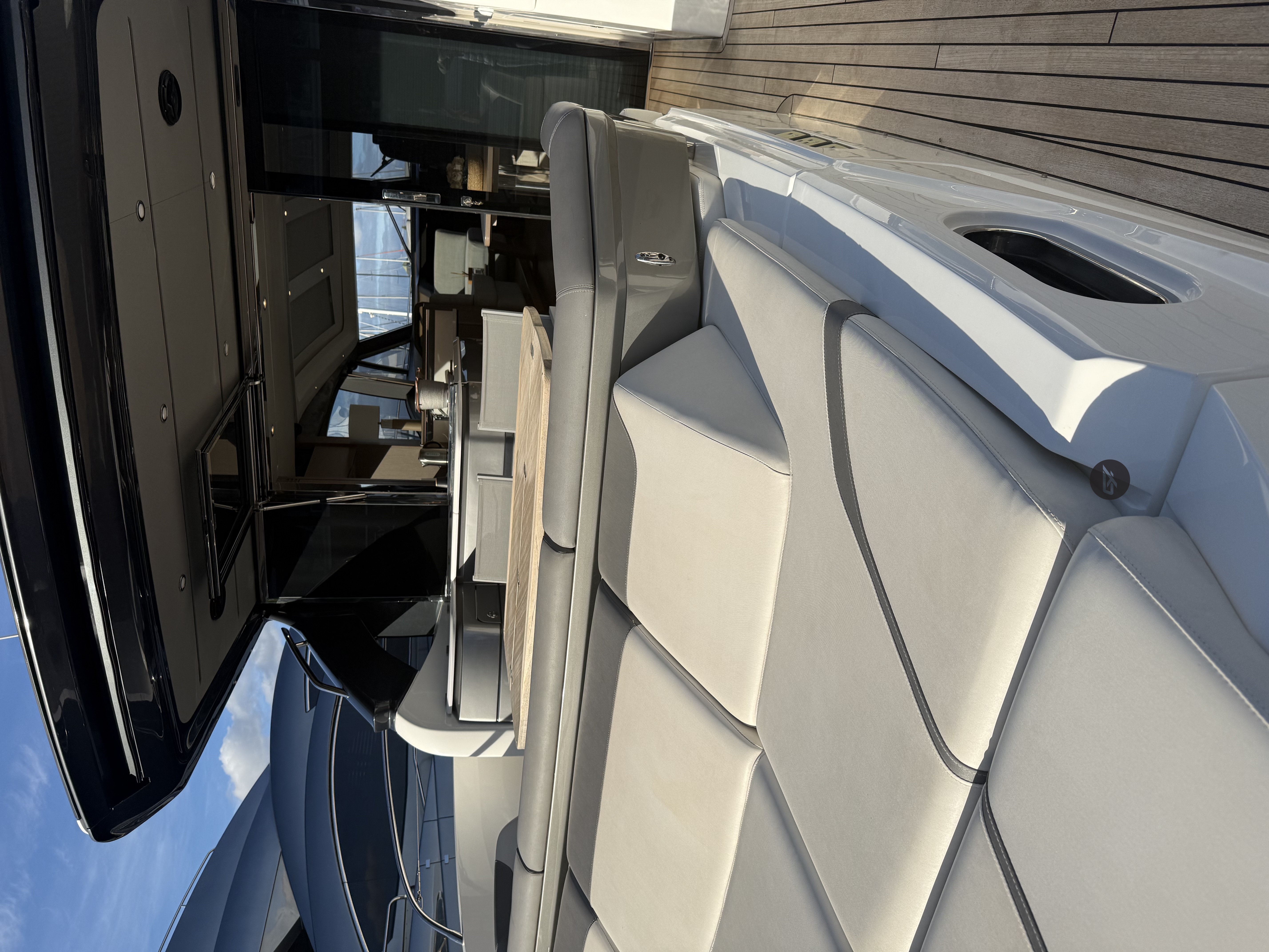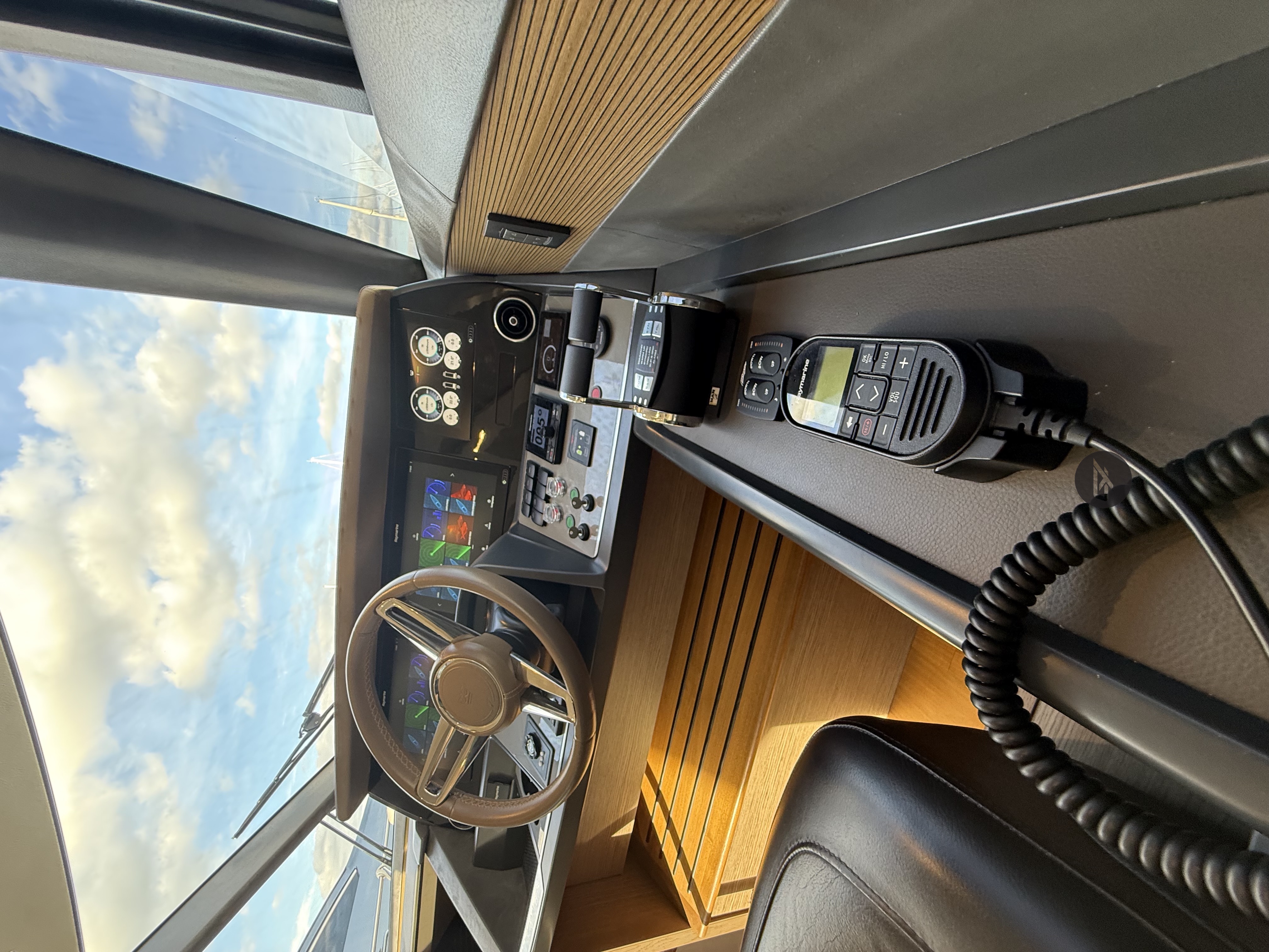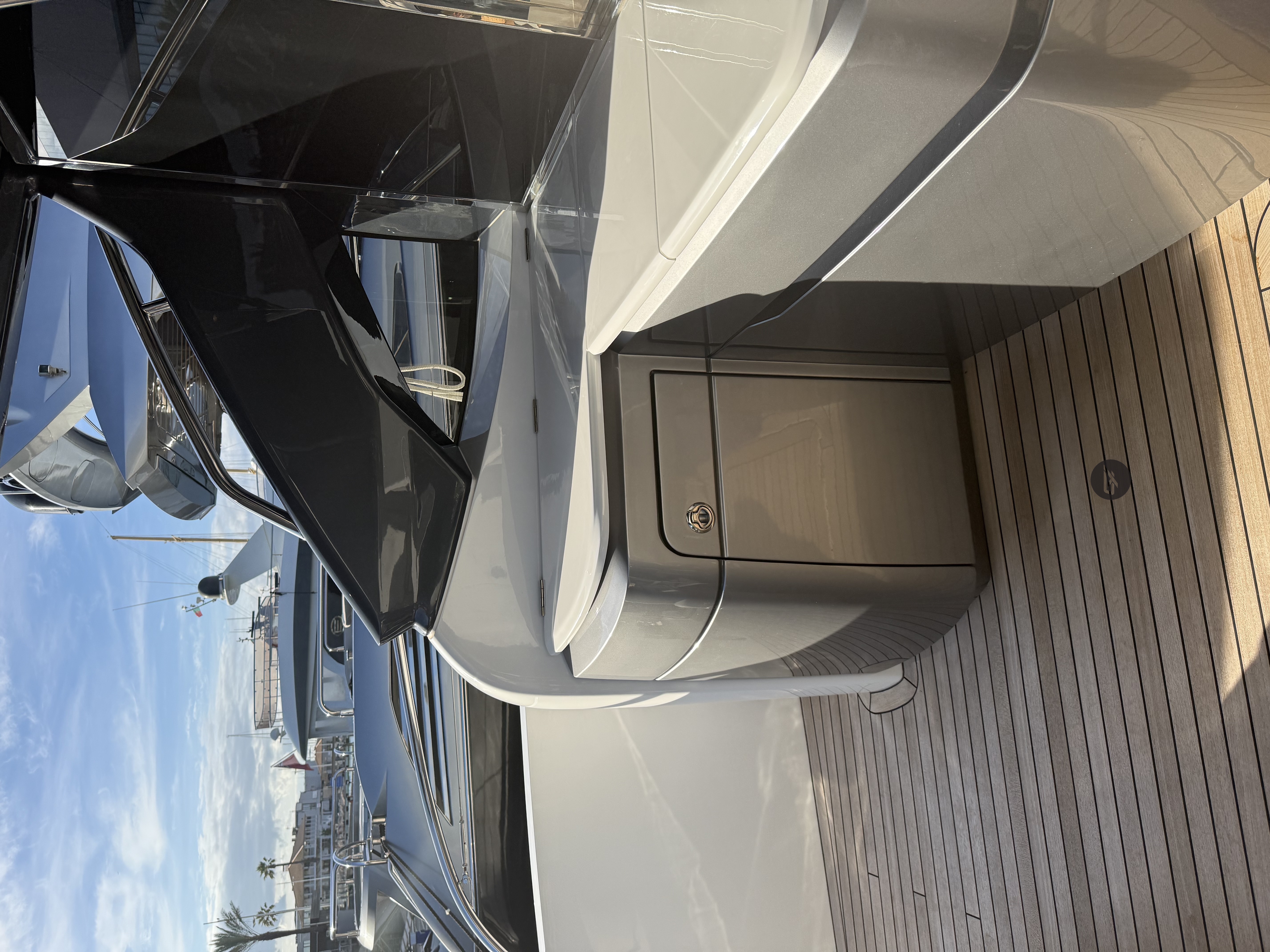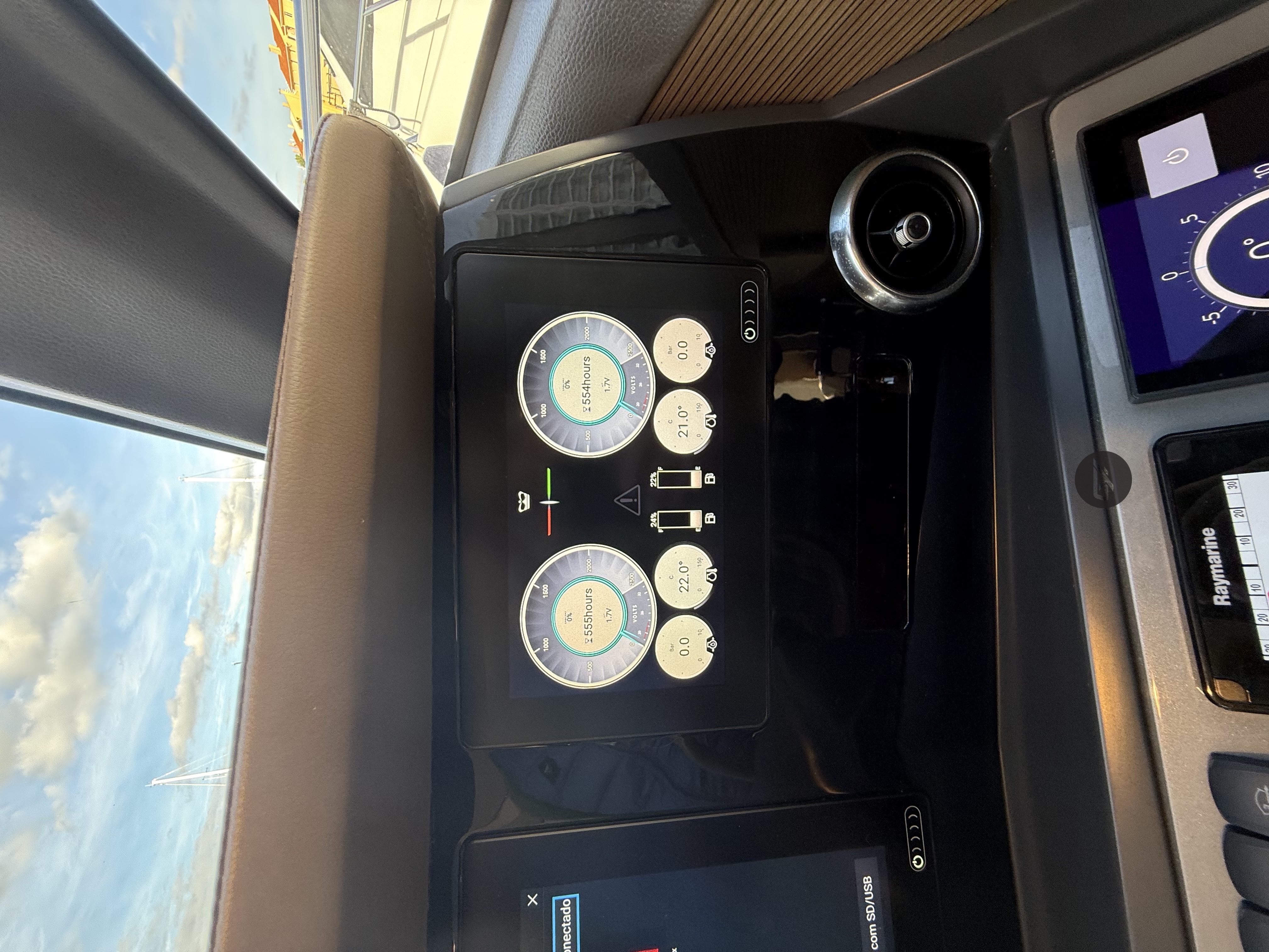 Well specified with Seakeeper NG9 gyroscopic stabiliser, upgraded Onan 17.5 kW generator, reverse-cycle air conditioning throughout and advanced Raymarine navigation including Axiom XL 16. Spacious cockpit with electric sun awning, barbecue, second helm station and hydraulic bathing platform.